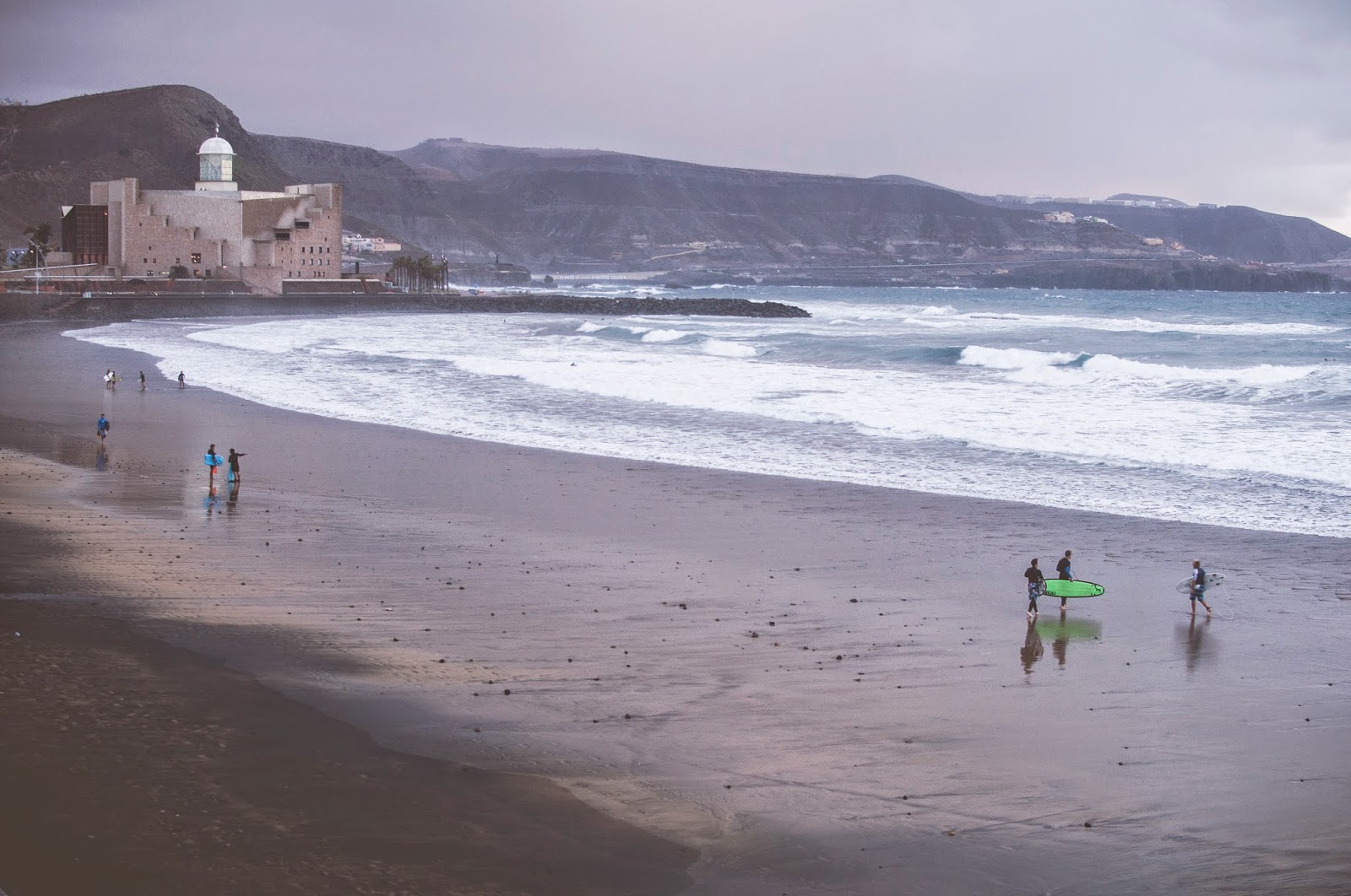 Spędziliśmy w Las Palmas aż trzy miesiące, a wybraliśmy to miejsce ze względu na temperaturę, europejską strefę czasową co znacznie ułatwia nam pracę, możliwość nauki surfowania i względnie niedużą odległość od Polski, a jak się też później okazało bezpośrednie loty z Warszawy (Ryanair). Mam mieszane uczucia co do tego miejsca, na pewno jest to fajny wybór, kiedy w Polsce jesień i zima, a chcesz się wygrzać na słońcu. Ale tu nie zawsze, bo pogoda bywała zmienna i trafiały nam się chłodne i wietrzne dni. Dodatkowo Gran Canaria jest specyficzną wyspą, gdzie na północy (Las Palmas) bywa właśnie chłodno, a na południu dziko grzeje cały rok. Ale tu haczyk. Las Palmas jest naprawdę fajną i nieobciachową miejscówką, gdzie nie ma za wielu turystów, są fajne knajpki i super surf spoty. A już na południu królują hotele all inclusive i dla mnie jest to spełnienie najgorszego turystycznego koszmaru, jest autentycznie przestrasznie. Więc trzeba się z ta pogodą liczyć, albo korzystać ze słońca w otoczeniu gości w kowbojskich kapeluszach i świecących naszyjnikach, co gorsza często gołych. Nie dzięki. Z dobrych wiadomości w Las Palmas jest stosunkowo tanio, dużo taniej niż w innych europejskich miastach na kontynencie. Jest sporo sklepów spożywczych, duże markety i ogromny wybór knajp. Tak podsumowując to doskonałe miejsce, aby spędzić interesujące i nie nudzące się 2 tygodnie. Dobra, ruszamy na wycieczkę po najlepszych miejscach w Las Palmas.